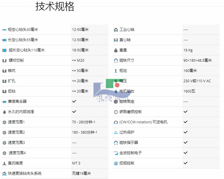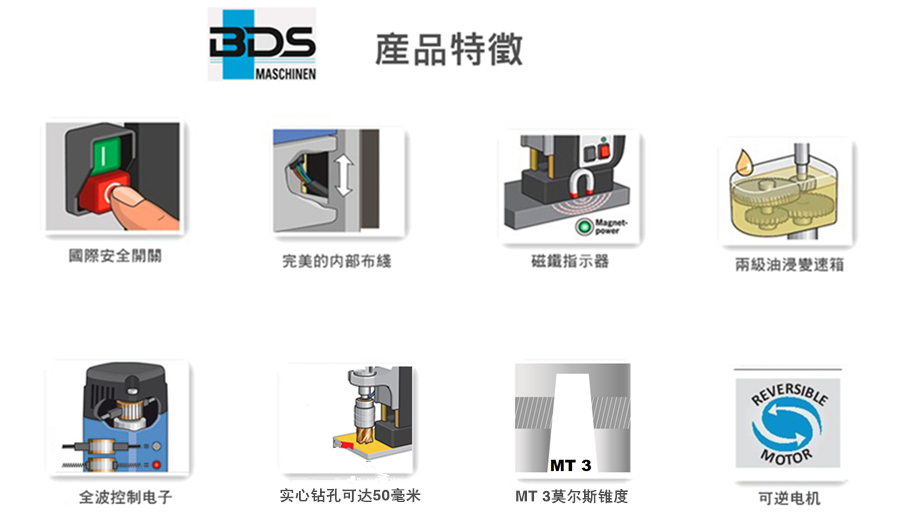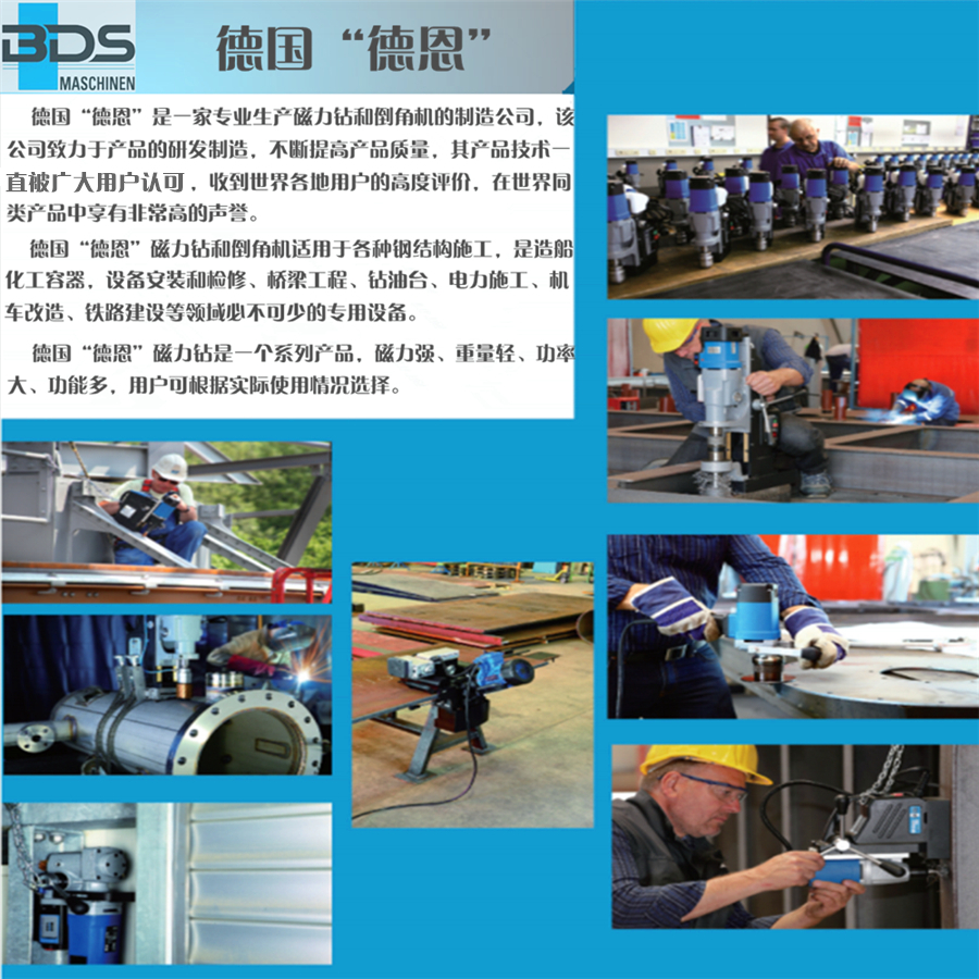 介紹:德國制造MAB 525磁力鉆床堅固輕便!采用兩級油浴齒輪箱,螺紋切削至M 20. MAB 525的優點>最佳的維修工作選擇:總重量僅為16 kg>采用MT 3刀柄,鉆孔性能可達50 mm >抗扭設計,整體式變速箱和滑塊強勁可靠的14.5安培雙絕緣電機19英寸高,35磅。高速,雙速油浴變速箱,非常適用于環形切割機和麻花鉆設計用于連續使用智能電子扭矩控制鉆至2-1 / 2“直徑。最多可達15/16“直徑。使用環形切割器直徑達1”的螺紋切割(帶可選卡盤IBC 21)攻絲能力15/16“集成切削油箱自動內部潤滑旋轉底座(型號MAB 525 SB)無鑰匙切割機安裝快速更換無鍵刀具系統,用于3/4“Weldon刀柄集成安全綠色/紅色LED磁力指示器,確保安全操作內部電纜布線簡單,符合人體工程學的單手操作控制裝置緊急關閉功能
