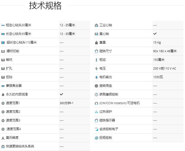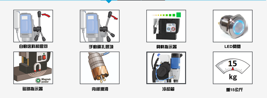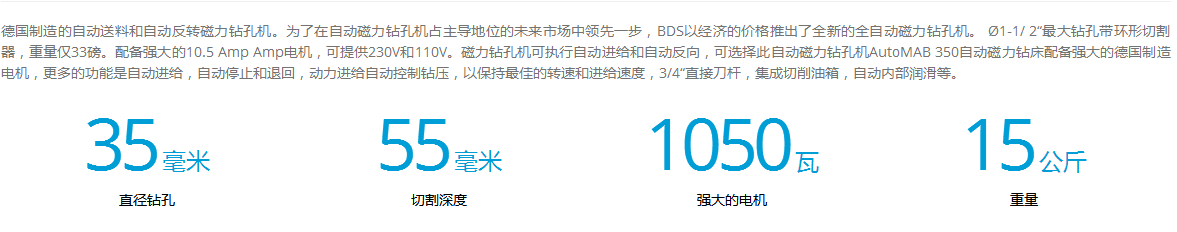 介紹:德國制造的自動(dòng)送料和自動(dòng)反轉(zhuǎn)磁力鉆孔機(jī)。為了在自動(dòng)磁力鉆孔機(jī)占主導(dǎo)地位的未來市場中領(lǐng)先一步,BDS以經(jīng)濟(jì)的價(jià)格推出了全新的全自動(dòng)磁力鉆孔機(jī)。 ?1-1/ 2“最大鉆孔帶環(huán)形切割器,重量僅33磅。配備強(qiáng)大的10.5 Amp Amp電機(jī),可提供230V和110V。磁力鉆孔機(jī)可執(zhí)行自動(dòng)進(jìn)給和自動(dòng)反向,可選擇此自動(dòng)磁力鉆孔機(jī)AutoMAB 350自動(dòng)磁力鉆床配備強(qiáng)大的德國制造電機(jī),更多的功能是自動(dòng)進(jìn)給,自動(dòng)停止和退回,動(dòng)力進(jìn)給自動(dòng)控制鉆壓,以保持最佳的轉(zhuǎn)速和進(jìn)給速度,3/4“直接刀桿,集成切削油箱,自動(dòng)內(nèi)部潤滑等。